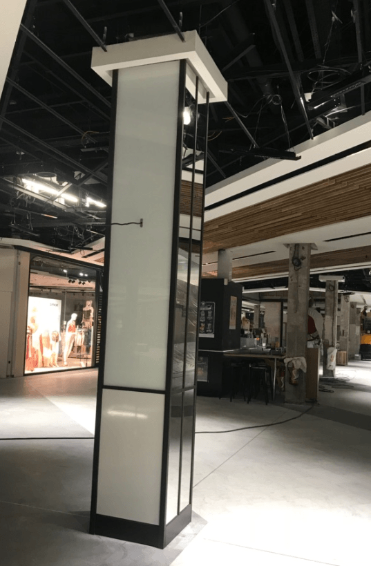 Rénovation : habillage inox mur et plafond, mains courantes acier, portes sorties de secours, façades de commerces, structures plafond en métal avec dispositions de panneaux LED.